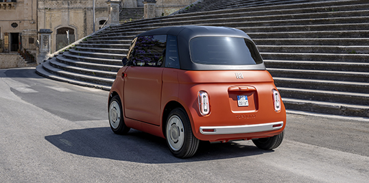Dank seiner kompakten Länge von nur 2,53 Metern und seiner herausragenden Manövrierfähigkeit ist der Topolino perfekt auf den Stadtverkehr abgestimmt. Mit einer Höchstgeschwindigkeit von 45 km/h und einer 5,4-kWh-Batterie, die eine Reichweite von bis zu 75 km (nach WMTC*) bietet, eignet er sich hervorragend für den Alltag, lässt sich einfach zu Hause aufladen und bietet freien Zugang zu verkehrsberuhigten Zonen und historischen Stadtzentren. Im Innenraum überrascht der Topolino durch seine Größe: Versetzte Sitze und große Glasflächen schaffen einen hellen, luftigen Innenraum, der einladend, offen und fröhlich wirkt.