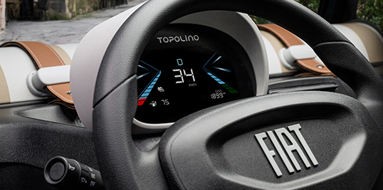 Der Topolino wird auch intuitiver dank seines brandneuen digitalen Kombiinstruments, das von 3,5 Zoll auf 5,7 Zoll vergrößert wurde und eine Gesamtfläche von 8,3 Zoll hat. Zudem bietet es vereinfachte Grafiken, verbesserte Lesbarkeit und eine hellere, freundlichere Optik.