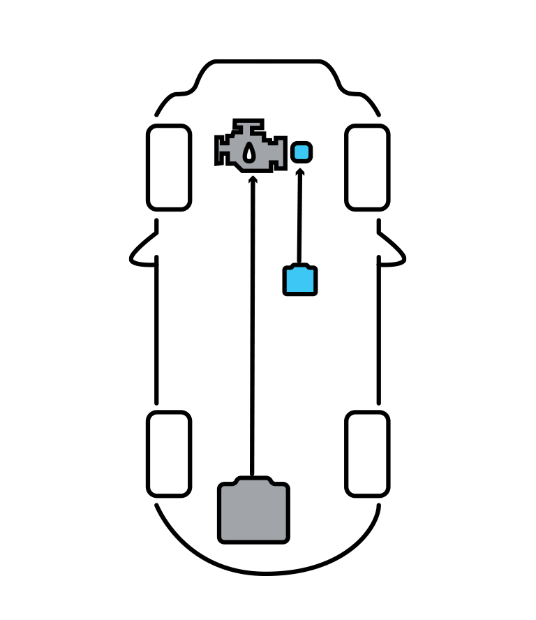 - Kompakte 48-Volt-Batterie, die die Leistung des Benzinmotors unterstützt