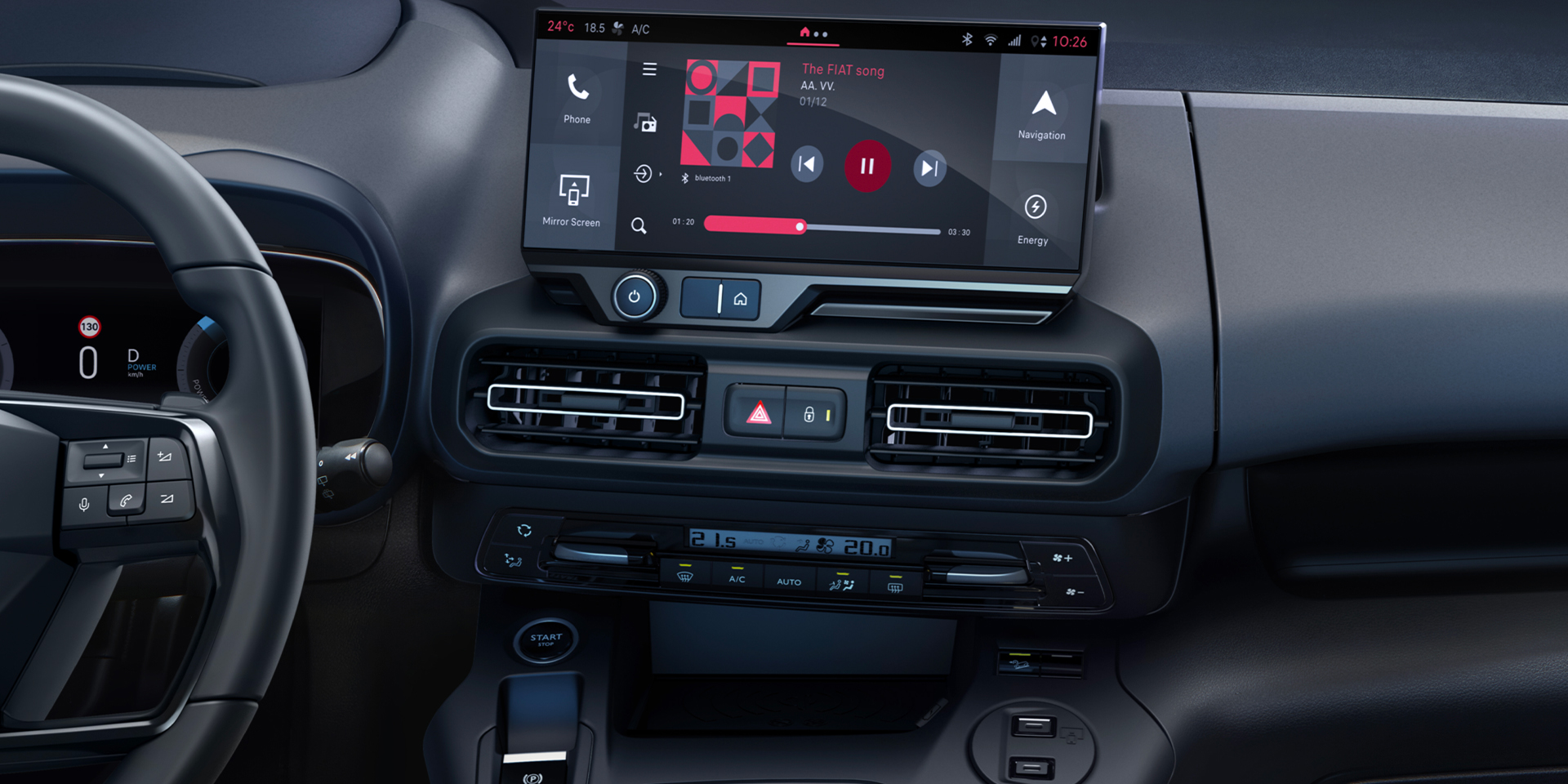 Setzen Sie Ihr Smartphone in die dafür vorgesehene Halterung ein und koppeln Sie es per Bluetooth mit dem Doblò. Anschließend können Sie Ihr Telefon und dessen Inhalte ganz bequem über die Bedienelemente am Lenkrad steuern.