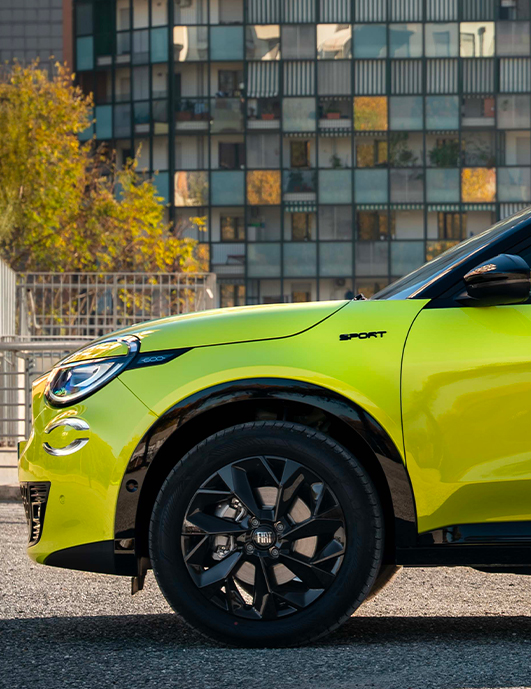 Der neue Fiat 600 Sport vereint Stärke und Eleganz. Jedes Detail ist so gestaltet, dass Sportlichkeit auf unverwechselbares Design und Raffinesse trifft, angefangen bei den 18"-Leichtmetallfelgen.