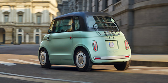 Der Topolino hat eine Lithium-Ionen-Batterie, die flach unter dem Boden des Topolino angebracht ist. Es handelt sich um eine 5,5-kWh-Batterie (Motor mit 6 kW - Spitzenwert von 9 kW beim Beschleunigen) mit einer Reichweite von 75 km im realen Betrieb (WMTC). Die Vorteile sind die gleichen wie bei unseren aktuellen Elektrofahrzeugen = Null CO2-Emissionen + leiser Betrieb.