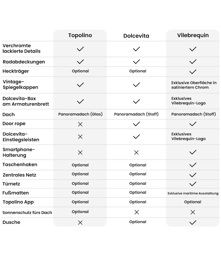 Lernen Sie alle Details Ihres neuen Topolino & Topolino Dolcevita kennen und wählen Sie die Version, die am besten zu Ihrem Lebensstil und Ihren Bedürfnissen passt.